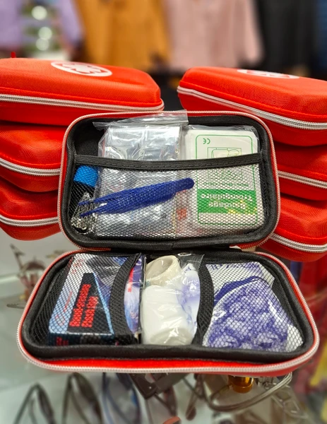 چسب زخم، پنس، گاز استریل، شریان بند، باند کشی، باند زخم، چسب باند، پد الکی، سوت، سنجاق قفلی، بروشور آموزشی، پتوی نجات، دستمال سه گوش، قیچی، چسب حلقه ای، چراغ قوه، کمپرس یخ